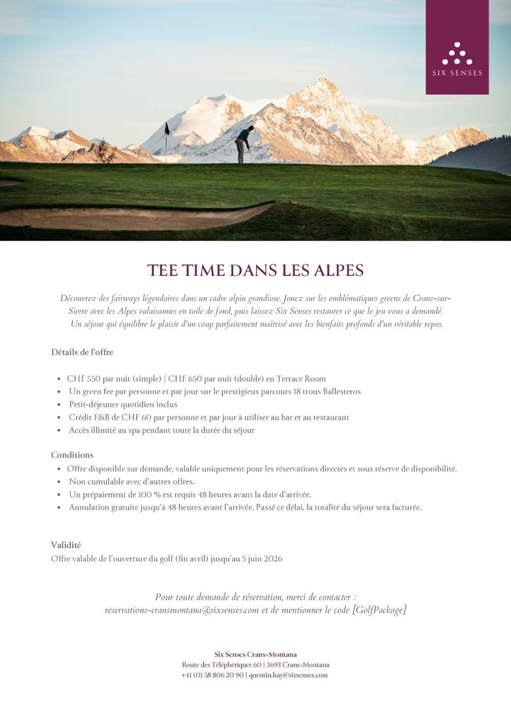Pour toute réservation, merci de contacter reservations-cransmontana (at) sixsenses.com en mentionnant le code [GolfPackage].